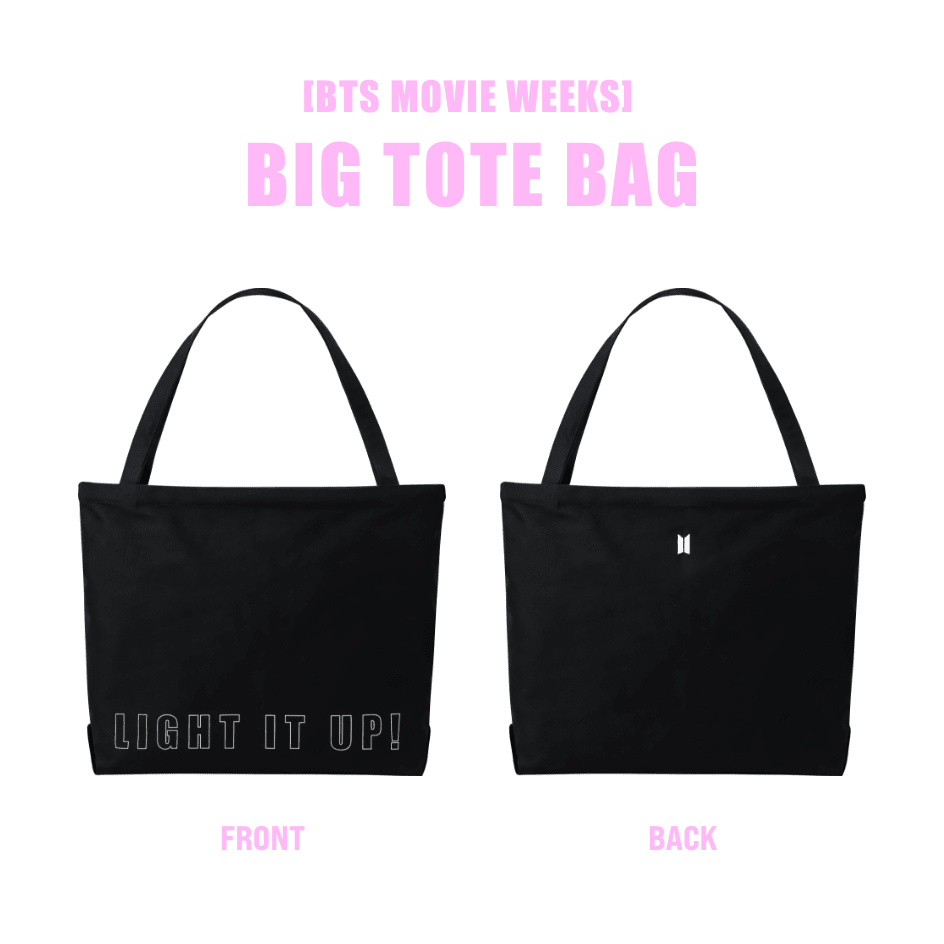 [BTS MOVIE WEEKS] BIG TOTE BAG54cm × 39cm × 11cm¥3,300 (税込)「BTS MOVIE WEEKS」を記念したBIG TOTE BAGです。映画のキャッチフレーズ “ LIGHT IT UP ! ” がプリントでデザインされています。裏面にはBTSロゴが刺繍されています。ZIP-UP HOODIEやCAPと合わせて様々なコーディネートをお楽しみください。