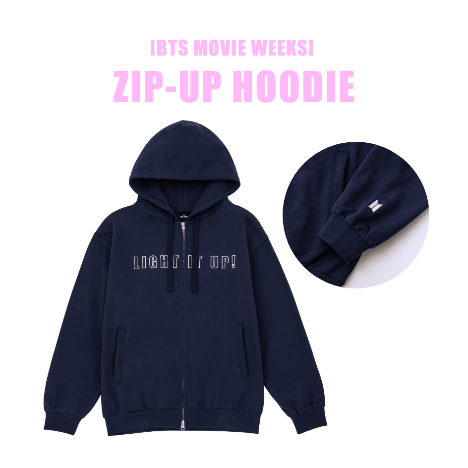 [BTS MOVIE WEEKS] ZIP-UP HOODIEBody length 70cm Shoulder width 55cm Chest width 58.5cm Bottom width 46cm Sleeve length 59cm¥8,000 (税込)「BTS MOVIE WEEKS」を記念したZIP-UP HOODIEです。映画のキャッチフレーズ “ LIGHT IT UP ! ” が刺繍でデザインされています。袖にはBTSロゴが刺繍されています。BIG TOTE BAGやCAPと合わせて様々なコーディネートをお楽しみください。